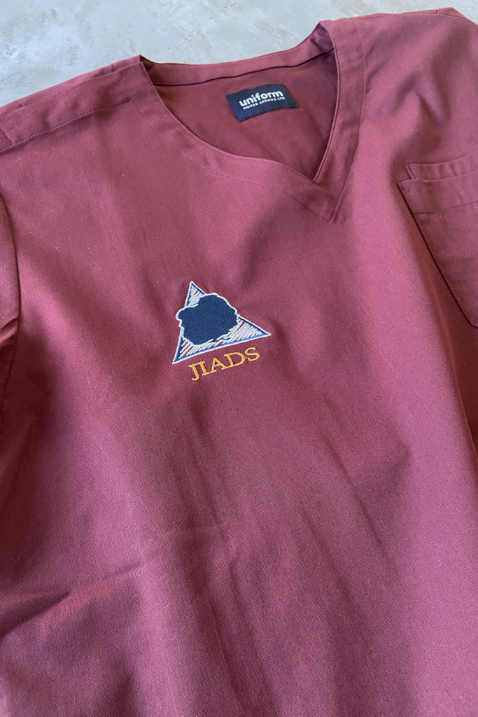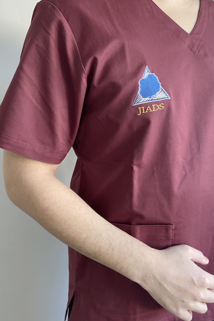 この研修の際に手渡されるのが、ロゴ刺繍入りのスクラブです。