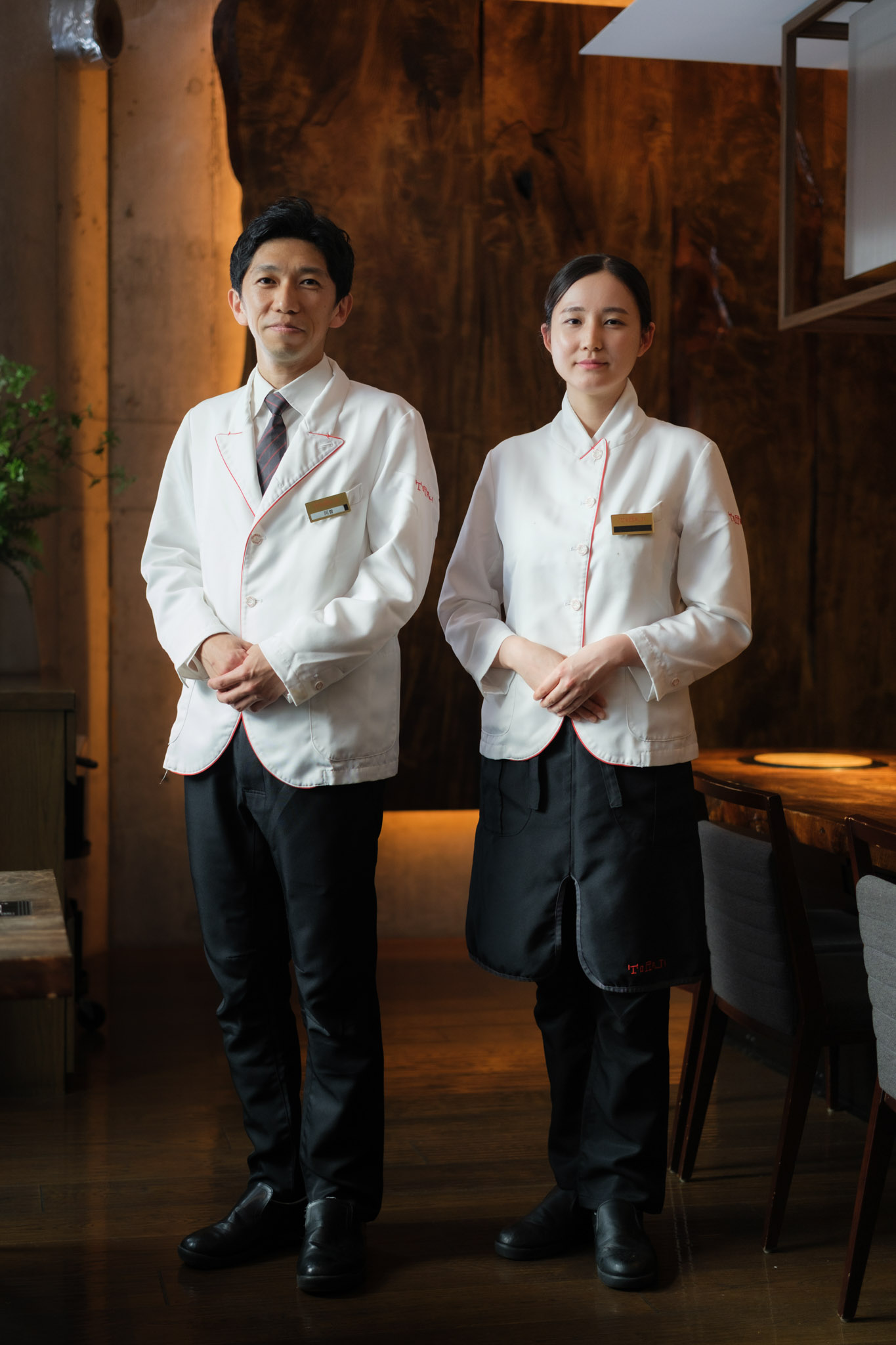 ホールやキッチンスタッフは、襟を立ててコックコートとして。このような2通りの着こなしができるようにしました。