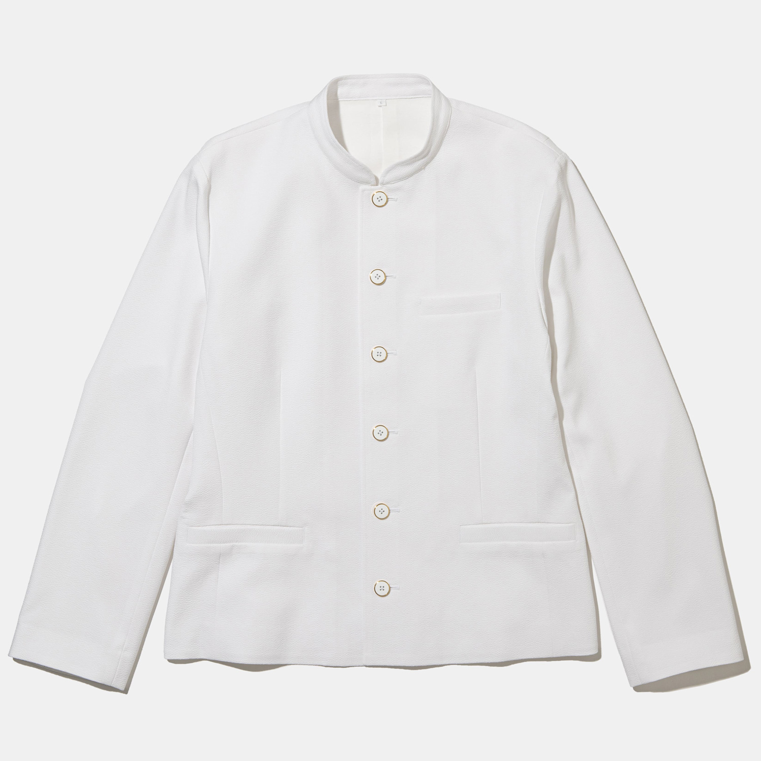 立襟で前中心が丸く削られたマオカラーは、首元の締め付けがないため涼しく快適でありながらも、高級感の漂う装いとなります。