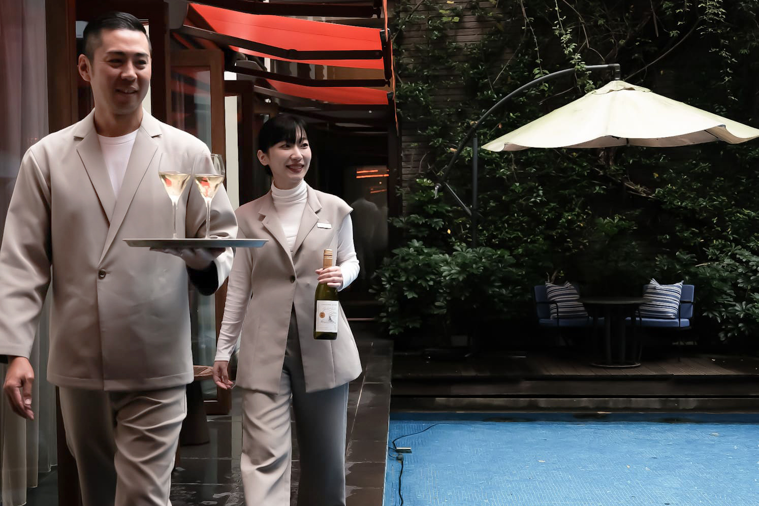 1階のフロントやレストランとの統一感を大切にし、ベージュのシャツに足さばきの良さで高評価をいただいているタブリエを組み合わせています。カフスにほどよいボリュームを持たせ、全体を引き締めるパイピングの配色を効かせるなど、細部にまでこだわったデザインが、洗練されたバランスを実現。既製品にはない、オーダーメイドならではの“ちょうどいい”一着が、ホテル全体の美意識と調和しながら、サービスの質も引き立てています。